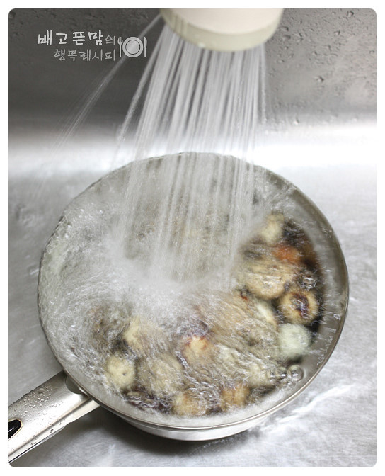 냄비의 뜨거운 물을 따라 버리고 찬물로 충분히 식도록 샤워를 시켜 주세요.
